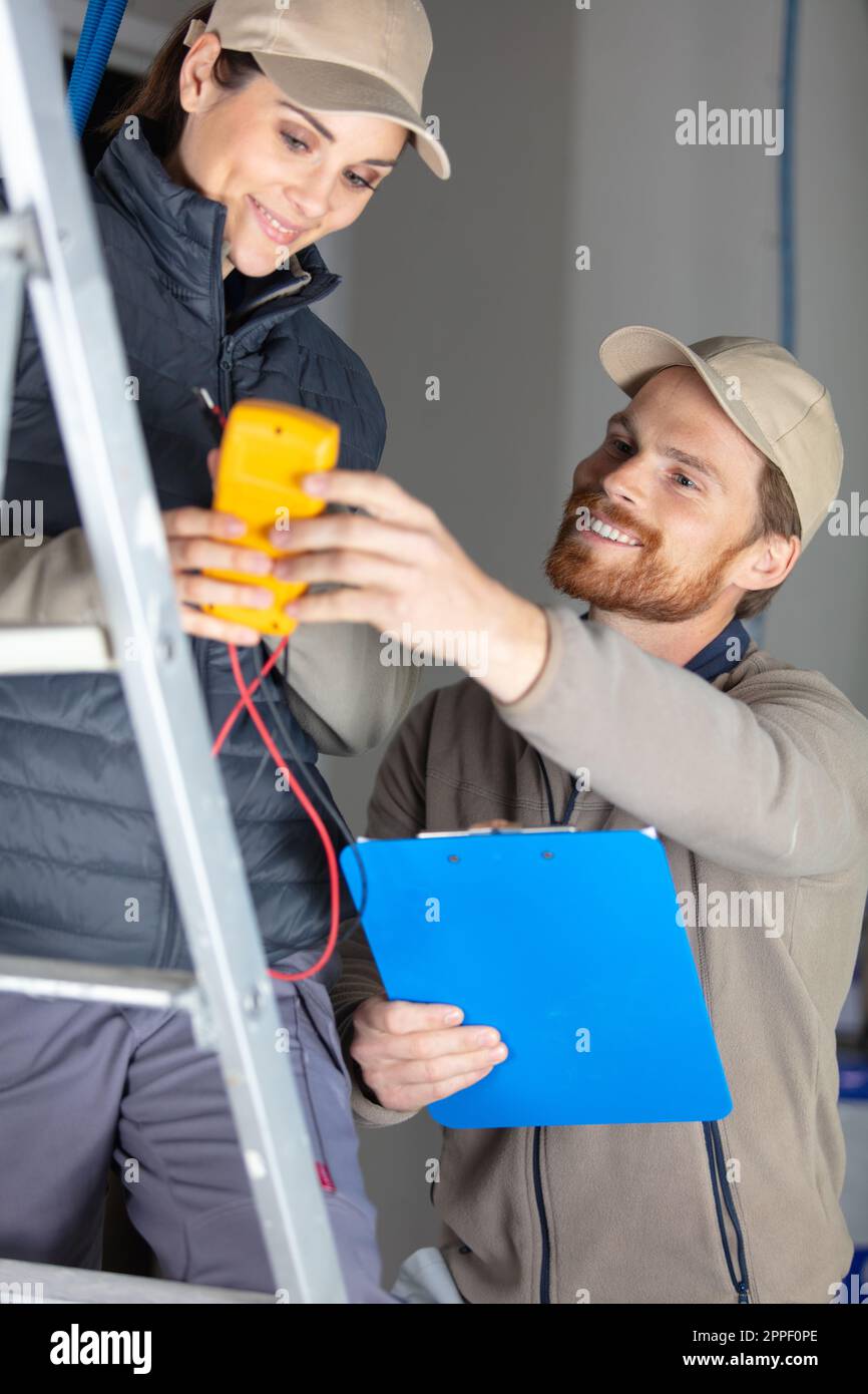 concentrate male apprentice with experimented mentor Stock Photo - Alamy