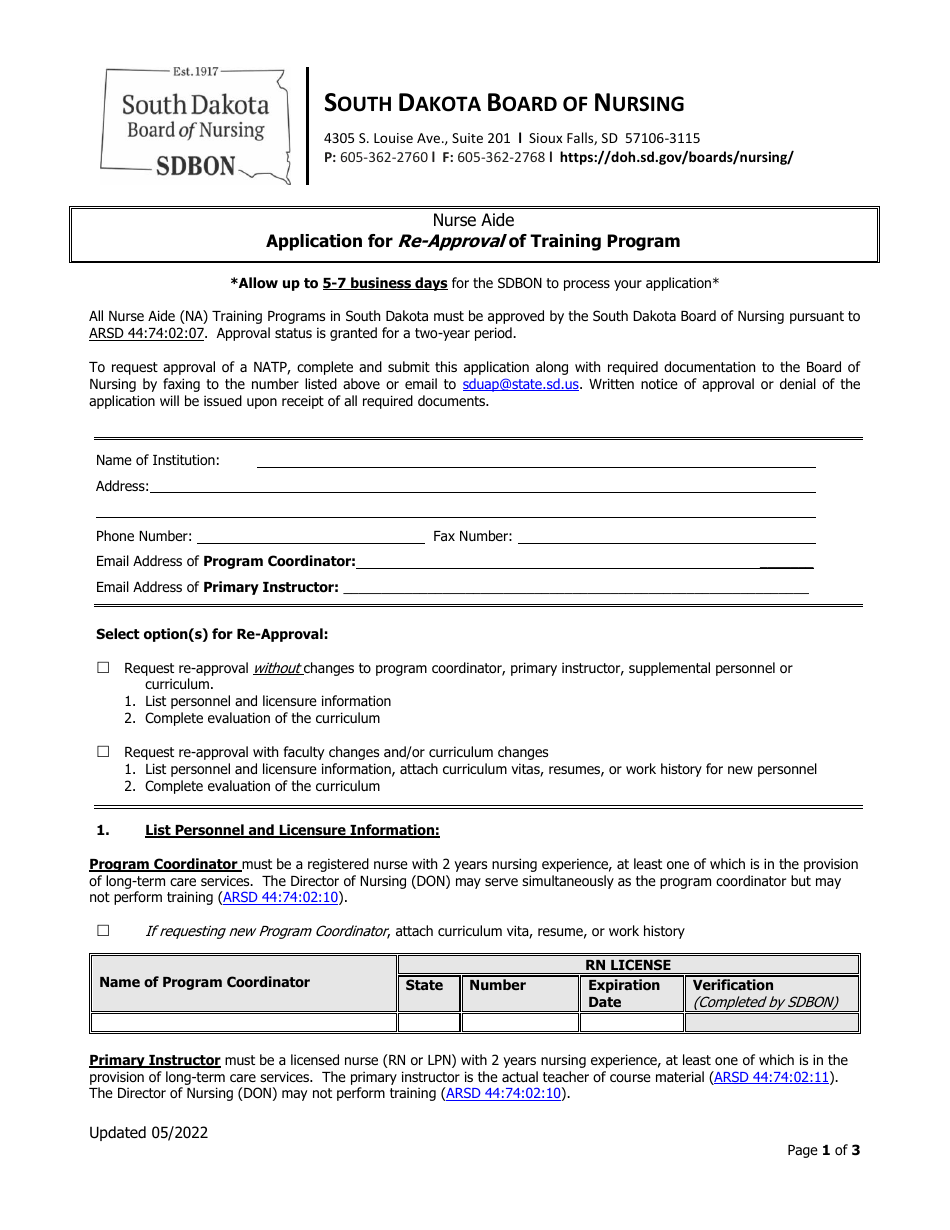 South Dakota Application for Re-approval of Training Program - Fill Out ...