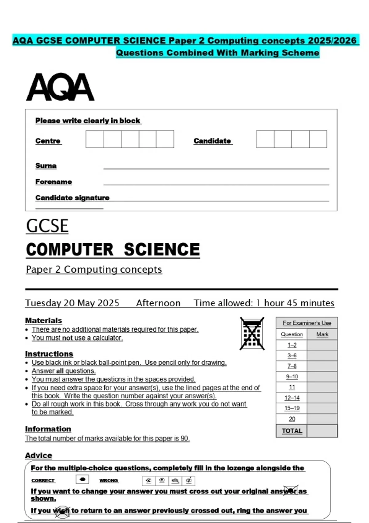 AQA GCSE Computer Science Exam Questions And Answers 2025 Update. - AQA ...