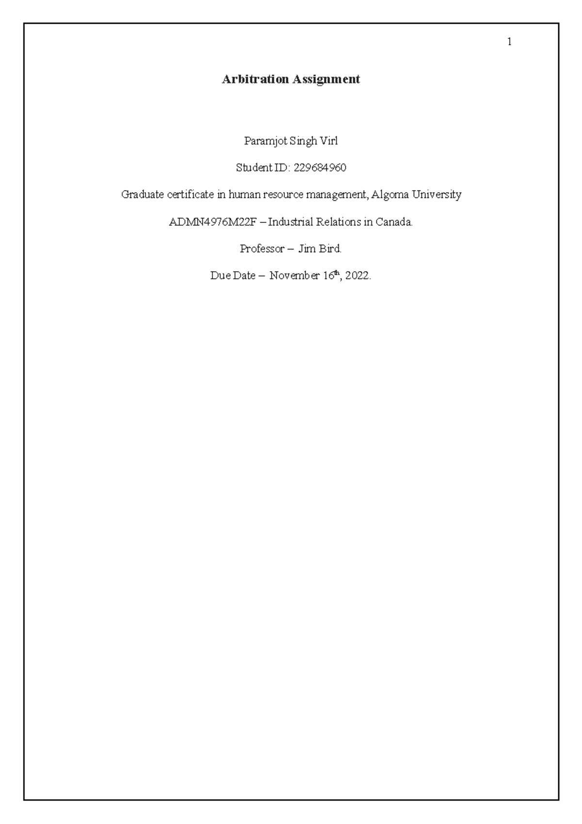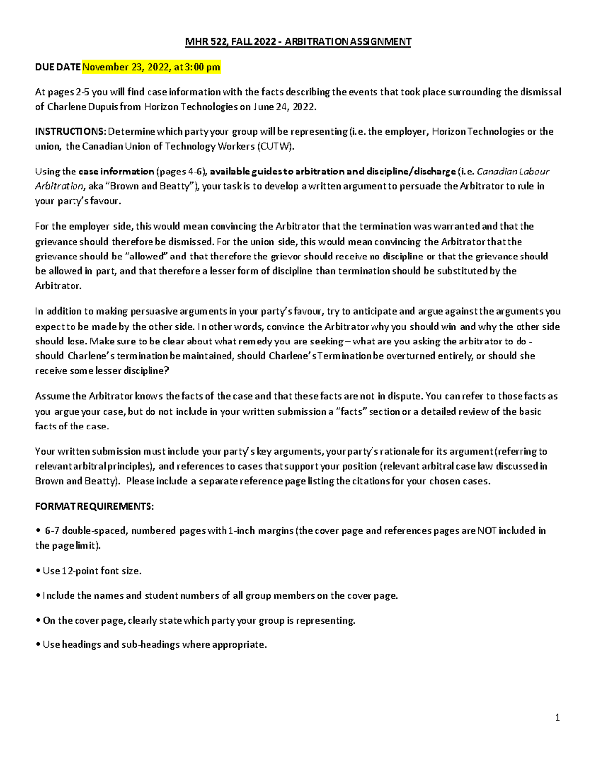 Arbitration - MHR 522, FALL 2022 - ARBITRATION ASSIGNMENT DUE DATE ...