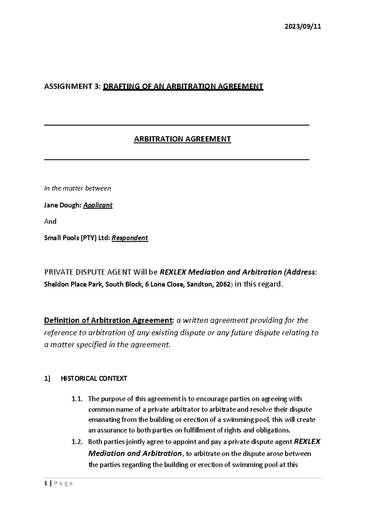 Assignment 3 - Arbitration Agreement - ASSIGNMENT 3: DRAFTING OF AN ...
