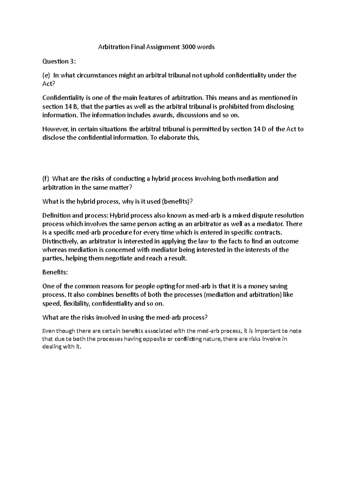 Arbitration Final Assignment 3000 words - This means and as mentioned ...