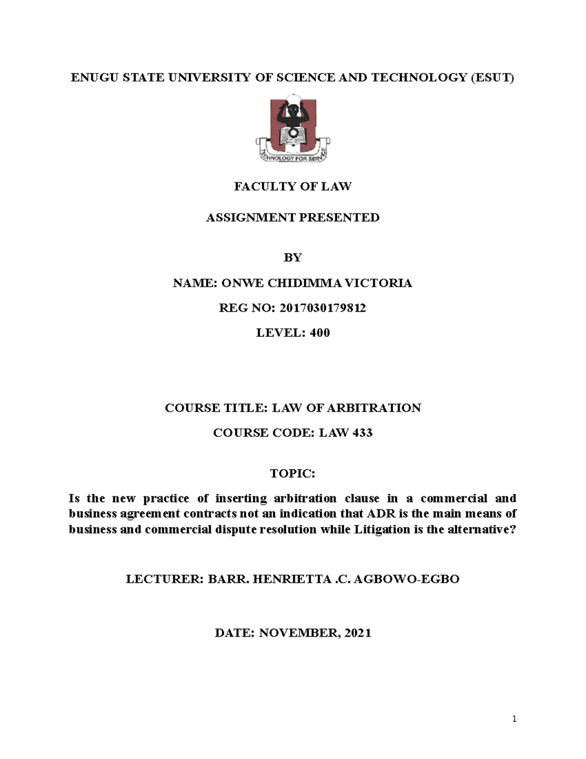 Arbitration assignment Ernest Agu - Enugu State University of Science ...