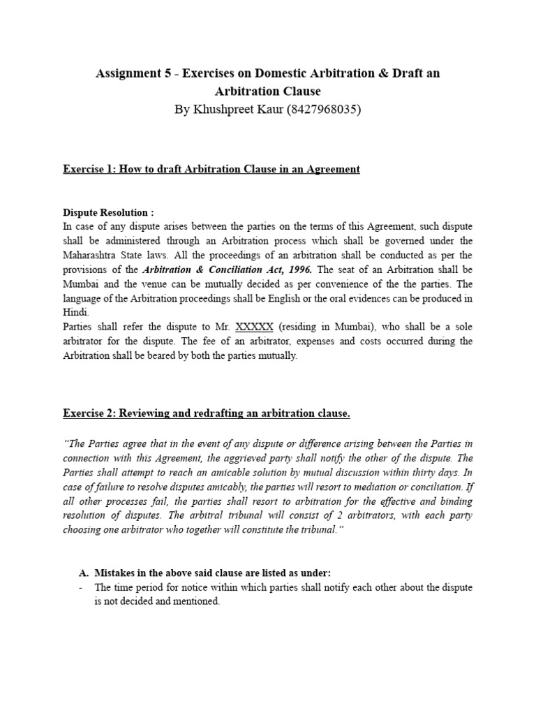Assignment 5 - Exercises On Domestic Arbitration & Draft An | PDF ...
