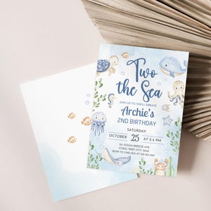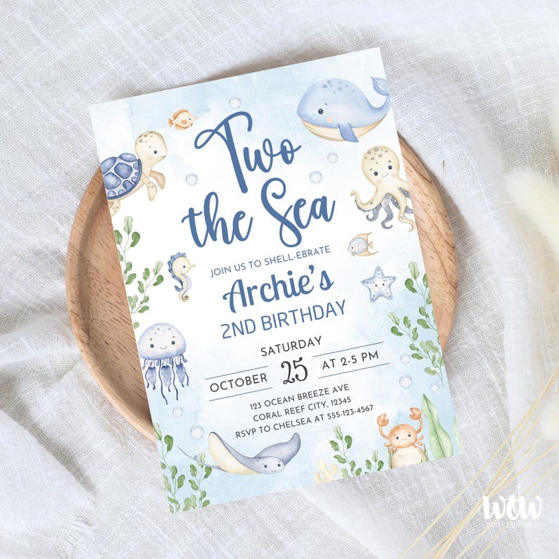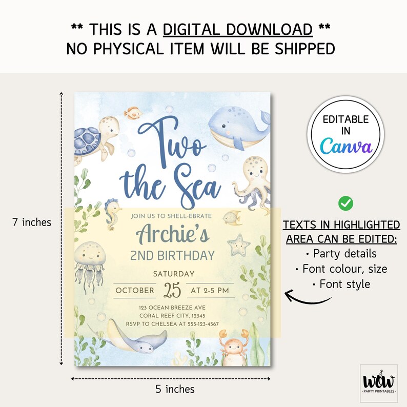 Two the Sea Birthday Invitation, Editable Canva Template, Sea Animals ...