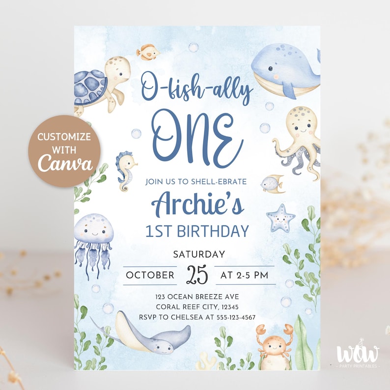 Under the Sea Birthday Invitation, O-fish-ally One, Editable Canva ...