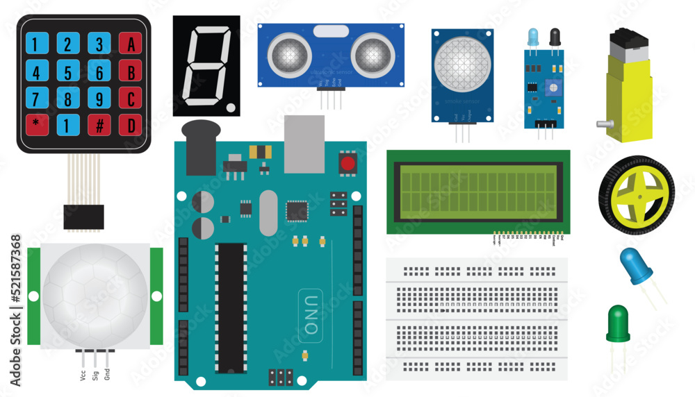 Arduino kit with sensor modules, lcd, keypad, motor and led. Stock ...
