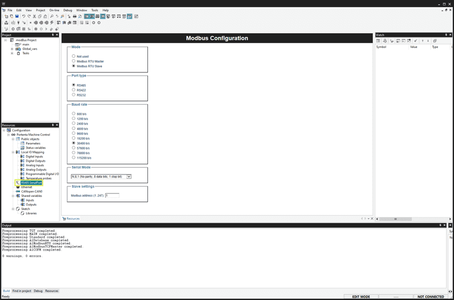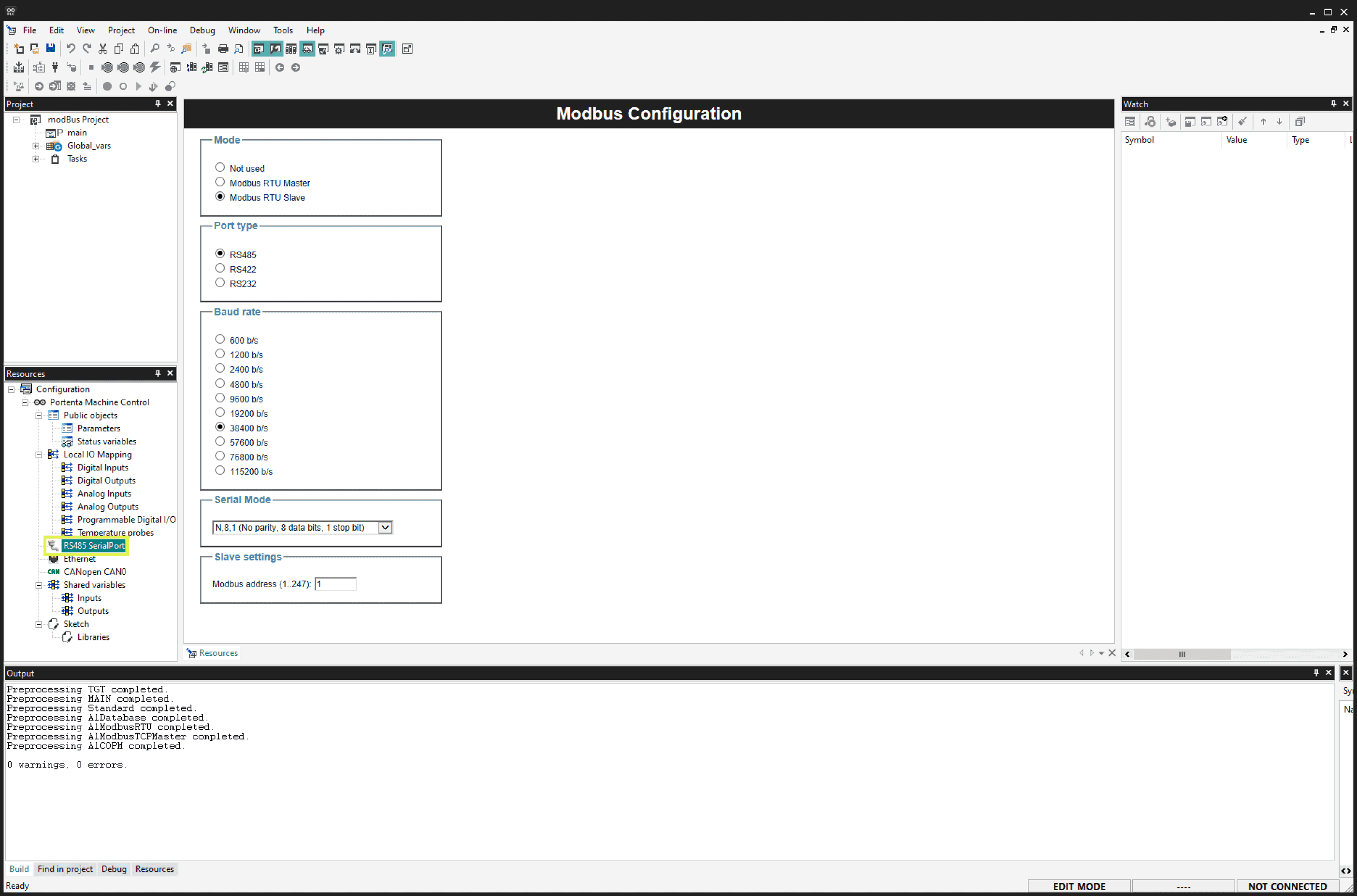 Arduino PLC IDE Resources panel, -> RS-485 settings