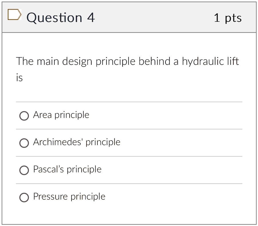 Question 4 1 pts The main design principle behind a hydraulic lift is ...