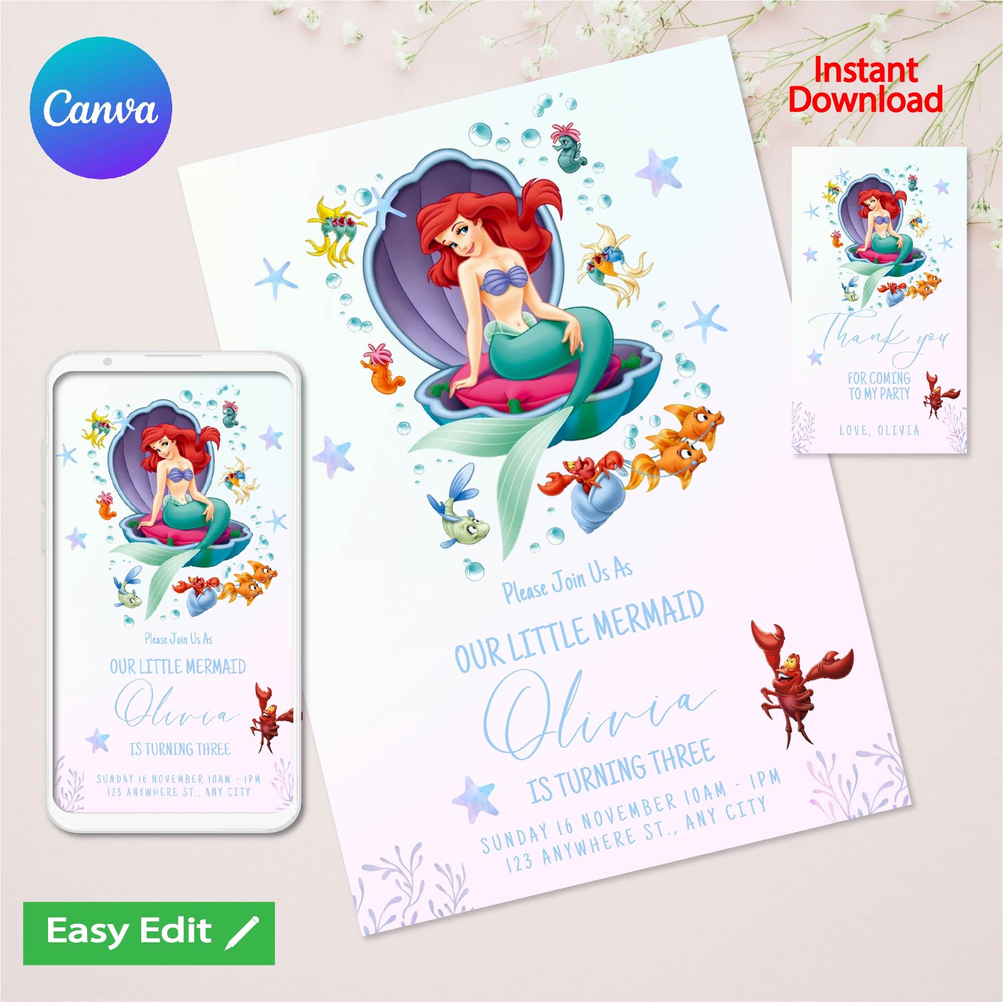 The Little Mermaid Ariel Invitation Easy Editable Instant Download ...