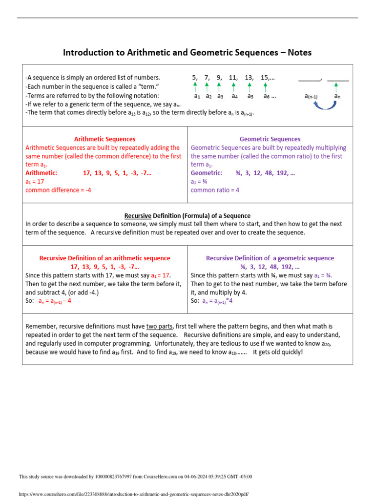 Introduction To Arithmetic and Geometric Sequences Notes dhr2020 PDF ...