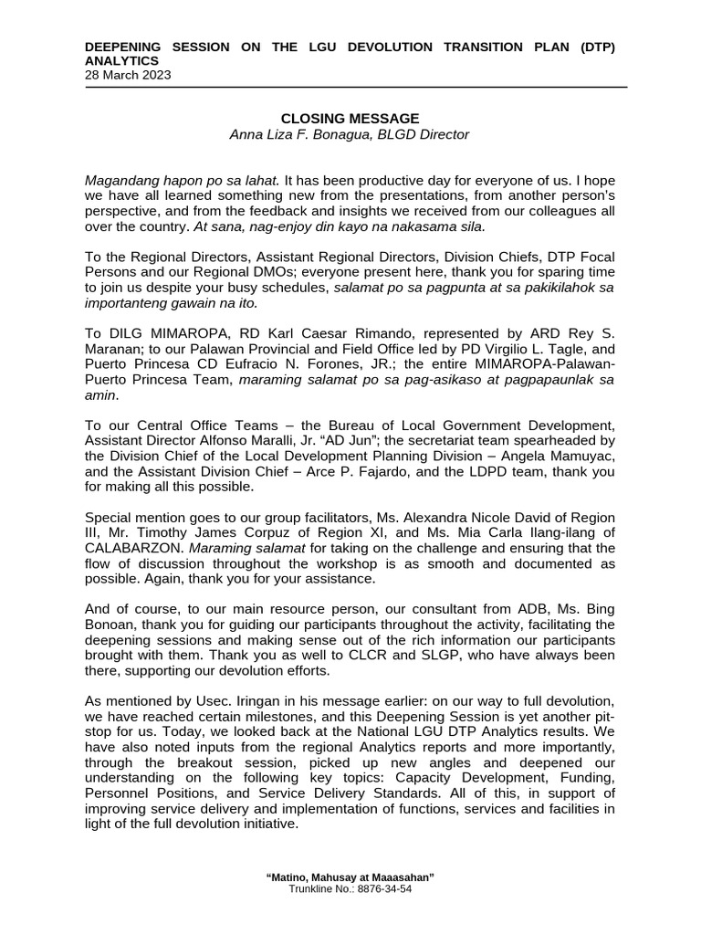 Barangay Devolution Transition Plan Front Page | PDF