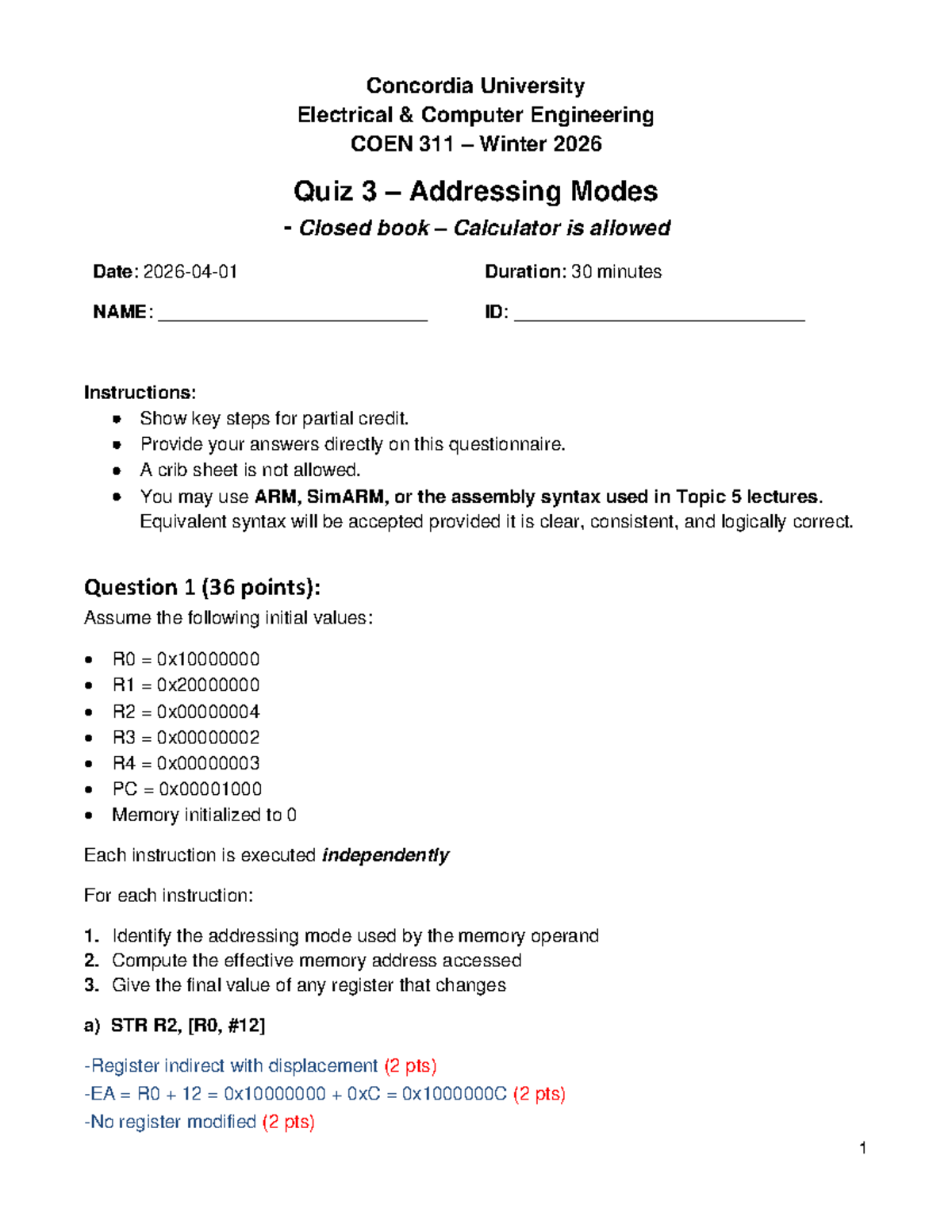 COEN 311 Winter 2026 Quiz 3 Solutions: Addressing Modes Explained - Studocu