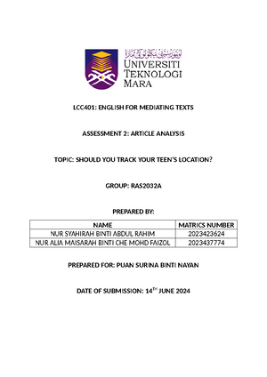 LCC401 Article Analysis Task Sheet & Sample for Mediation Project - Studocu