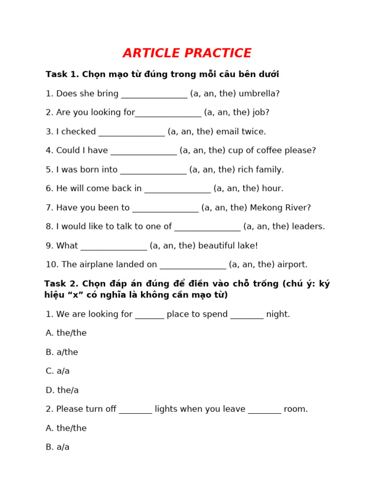 Article Exercise - Practice - ARTICLE EXERCISE I. Choose the correct ...