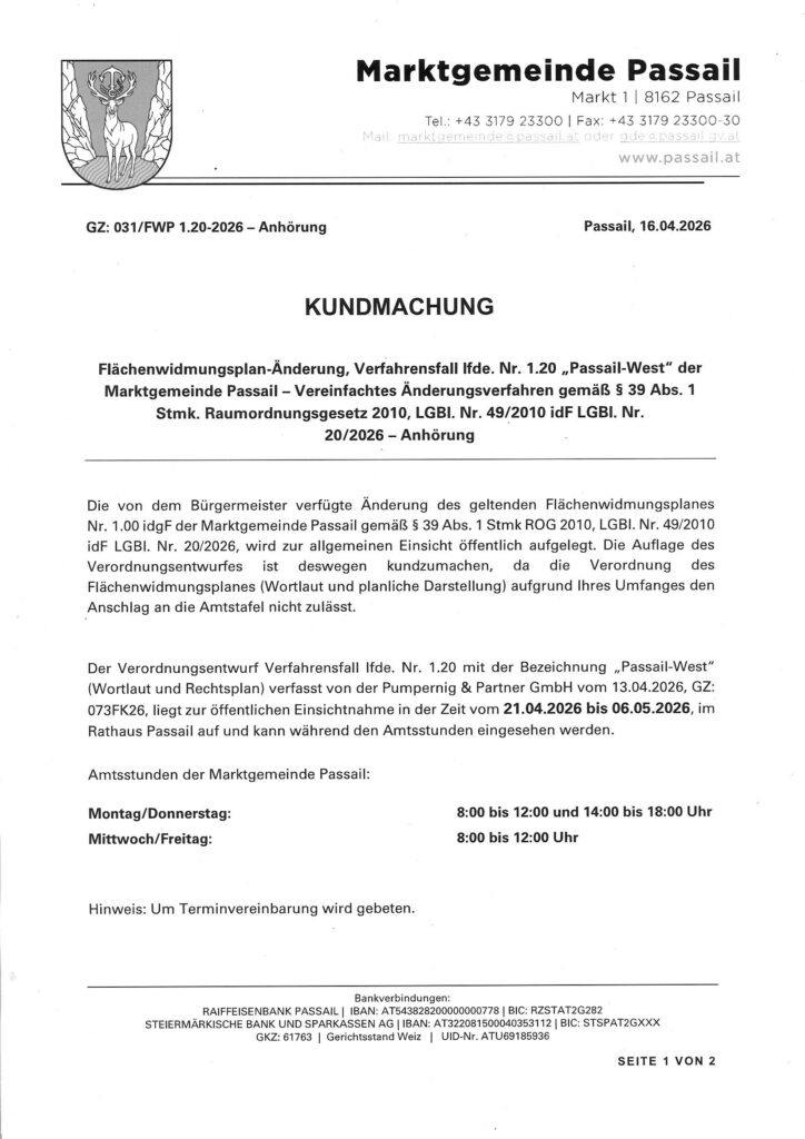 KUNDMACHUNG FLÄCHENWIDMUNG-ÄNDERUNG „PASSAIL-WEST“ – Marktgemeinde Passail