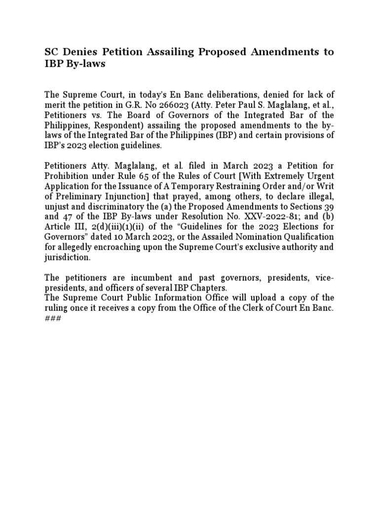 SC Denies Petition Assailing Proposed Amendments To IBP | PDF
