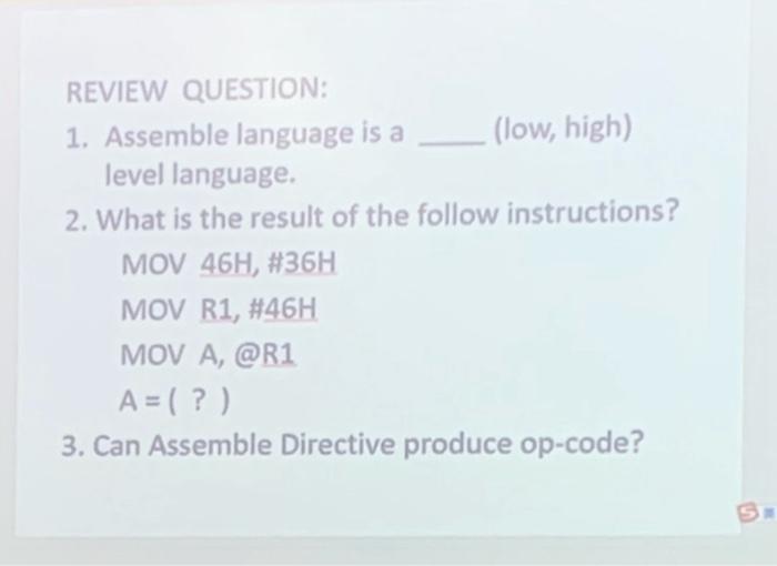 Solved REVIEW QUESTION: 1. Assemble language is a (low, | Chegg.com