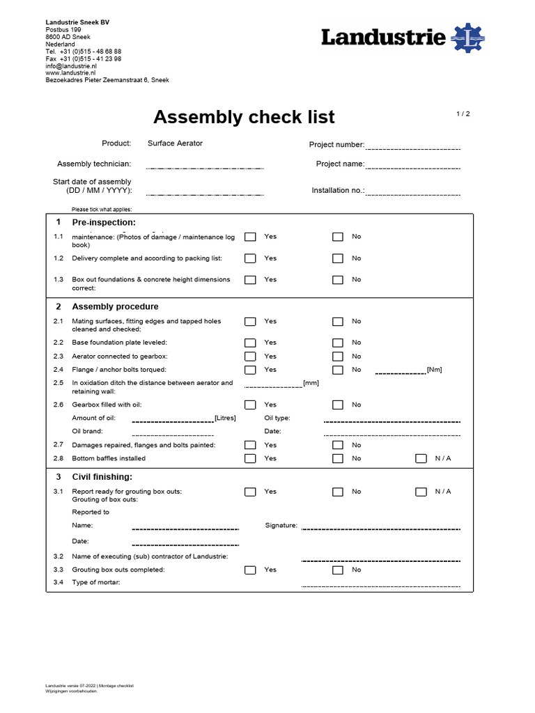 Landustrie Assembly Checklist Document | PDF