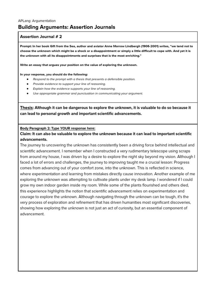 Assertion Journal How To with Example by Leas ELA Classroom | TPT
