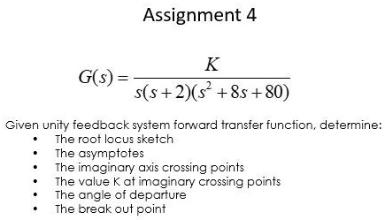 Assignment 4 G(s) = (K)/(s(s+2)(s^2+8s+80)) Given...