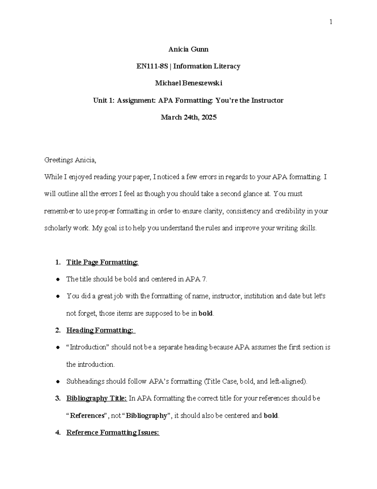 EN111-8S APA Formatting Review for Assignment 1 by Anicia Gunn - Studocu