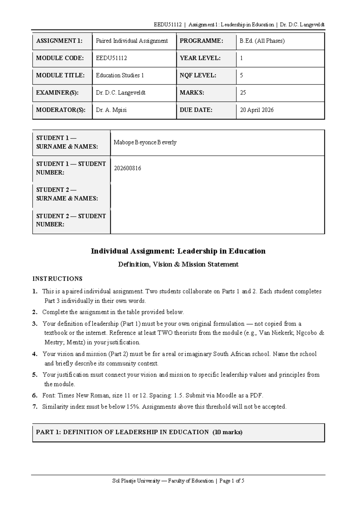 EEDU51112: Assignment 1 - Leadership in Education - Studocu