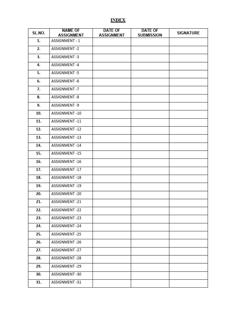 Index Paper for Projects / Index Sheets for Assignments, Projects - 24 ...