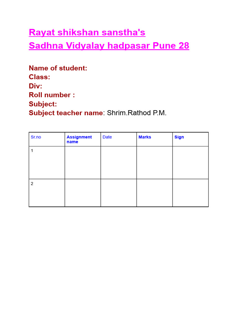 ASSIGNMENT NAME CLASS ROLL SUBJECT | Names, Subjects, Class