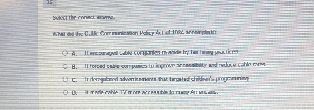 Solved: Select the correct answer. What did the Cable Communication ...