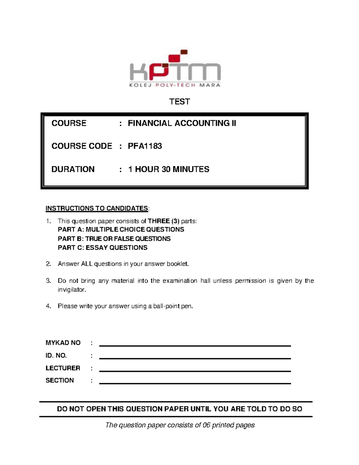 PFA1183 FINANCIAL ACCOUNTING II TEST SET A QP MAY 2024 - Studocu
