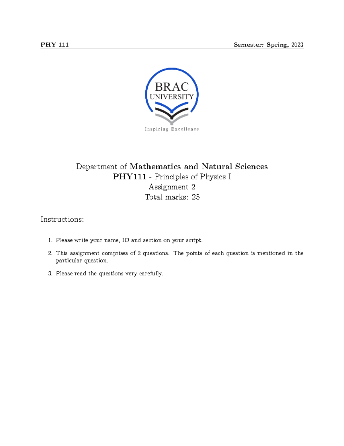 Assignment 2 Spring 2023 PHY111 - PHY 111 Semester: Spring, 2023 ...