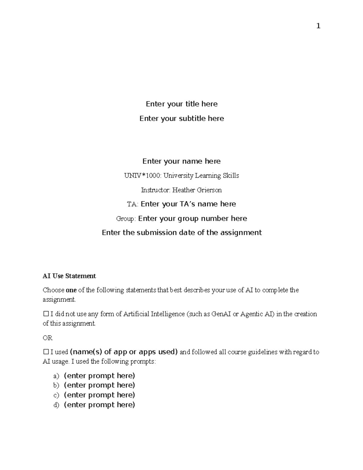 UNIV1000 Assignment Title Page and AI Use Statement - Studocu