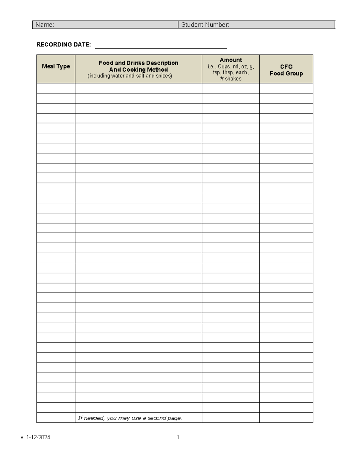 Assignment 1 Food Record Template_ 2025 - HLSC2820U - Name: Student ...