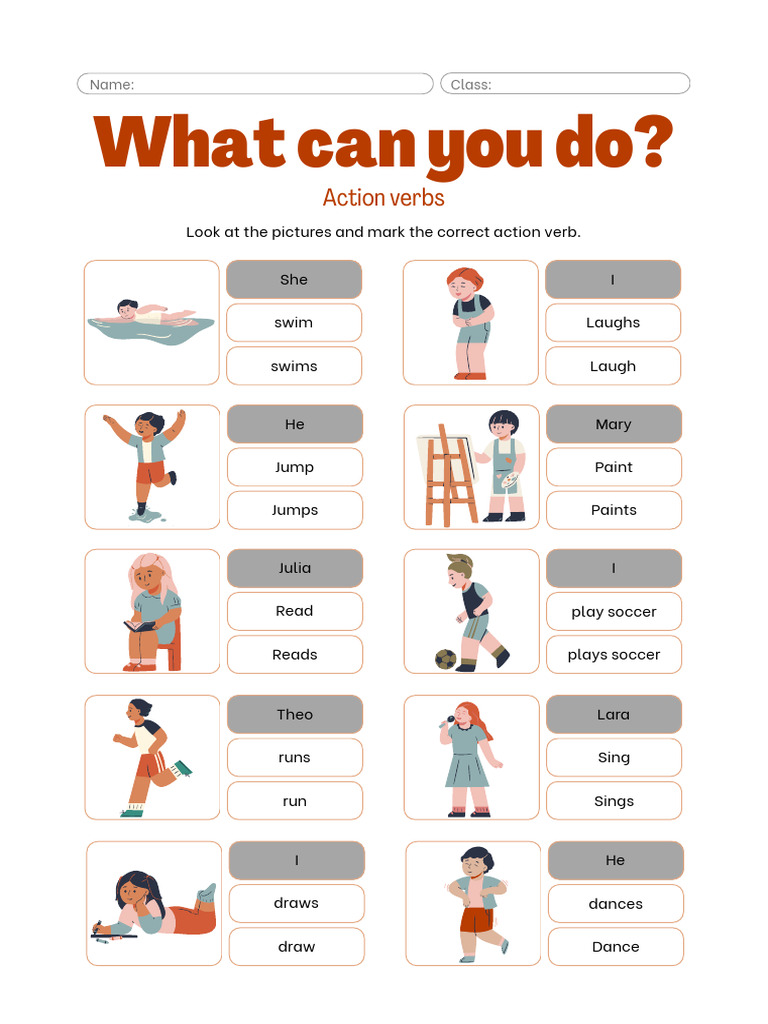Orange White Illustrative Action Verbs Worksheet | PDF