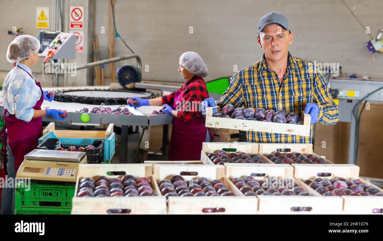 Man standing in sorting room with wooden box full of plums Stock Photo ...