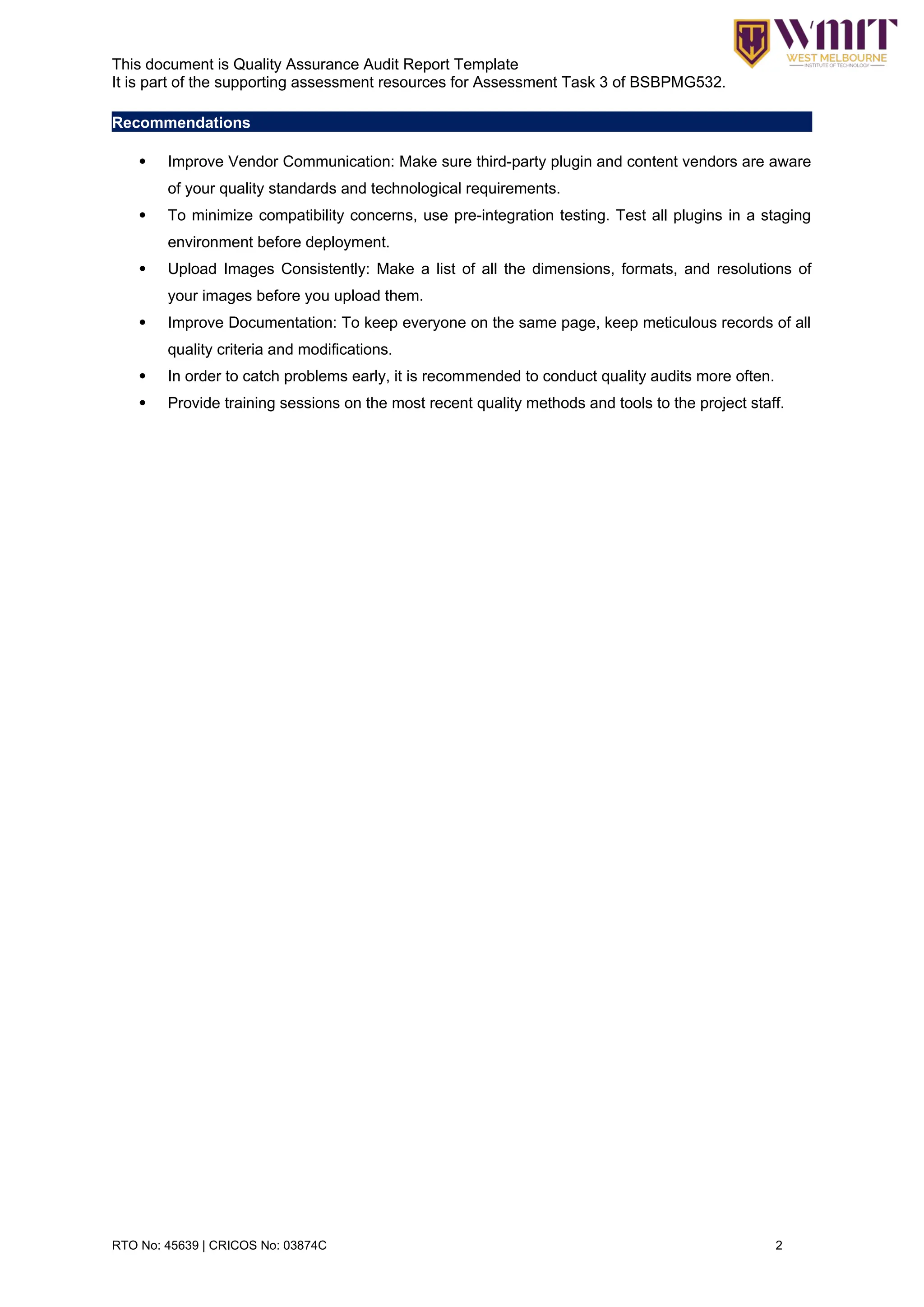 BSBPMG532 SD Quality Assurance Audit Report Template V1.0 (ID 180792 ...