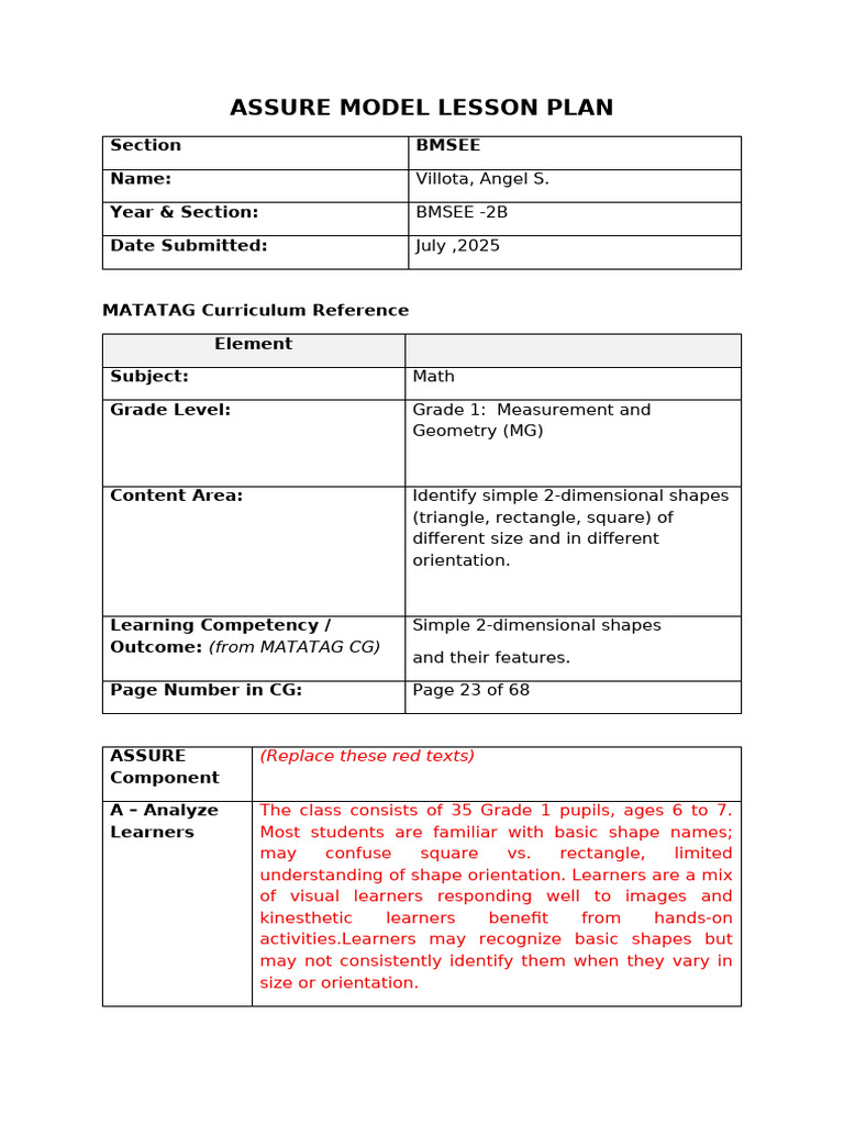 Template For ASSURE MODEL LESSON PLAN | PDF | Shape | Learning