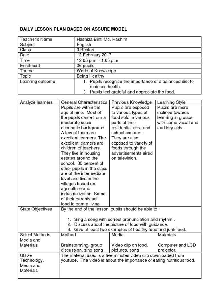 Example of ASSURE MODEL Lesson Plan | Download Free PDF | Educational ...