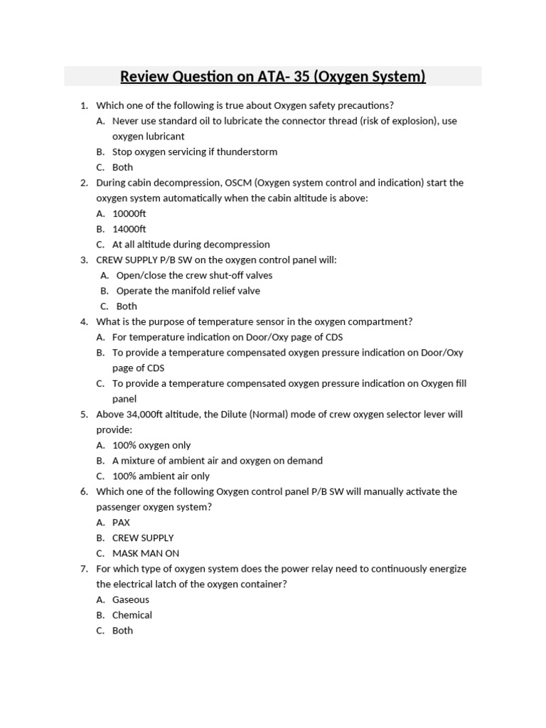 ATA - 35 Review Questions - Oxygen System - Answer | PDF