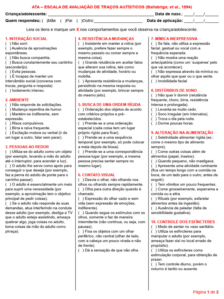 ATA - Escala de Avaliação de Traços Autísticos | PDF | Aprendizado | Dormir