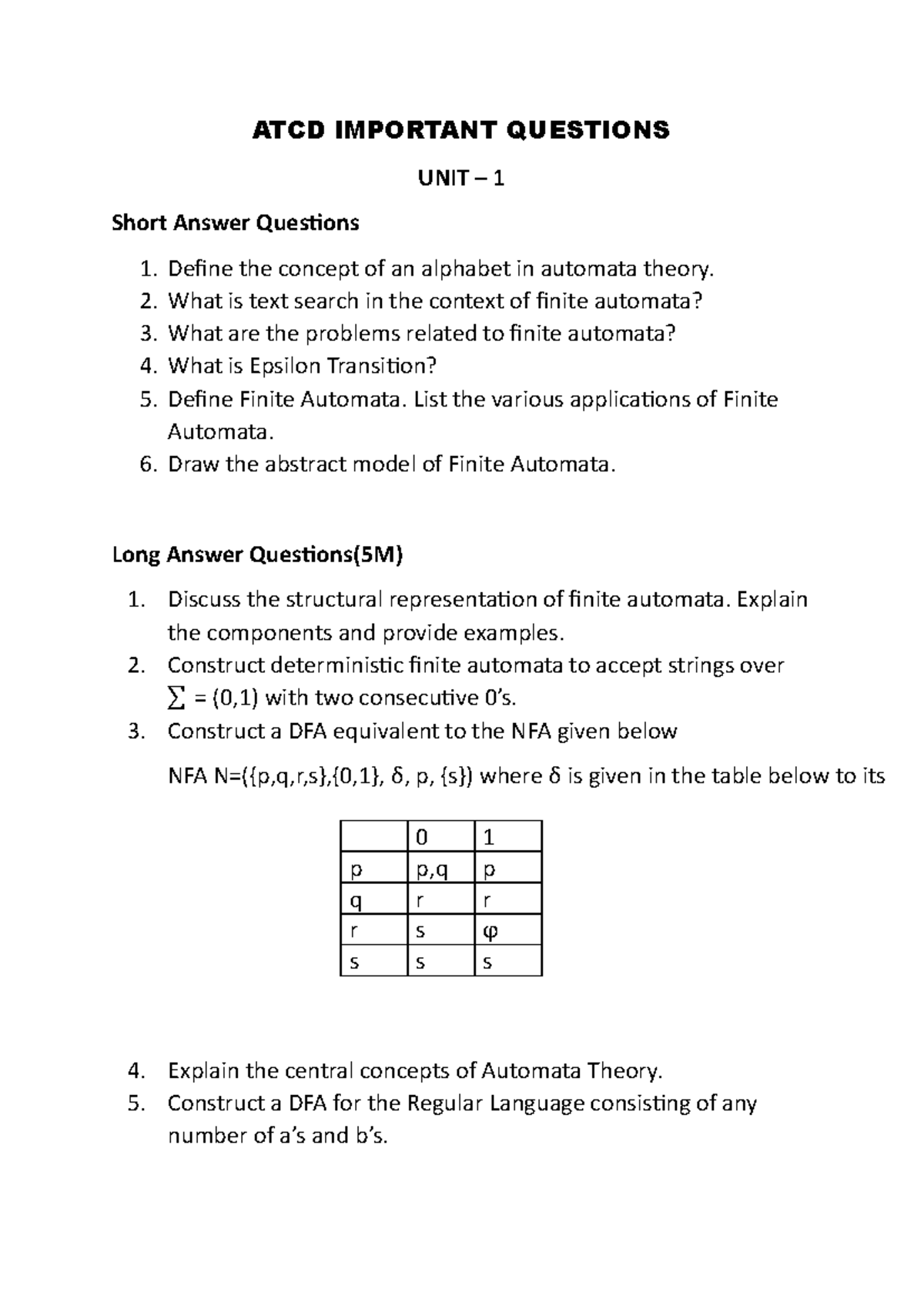 ATCD-1 Important Questions: Automata Theory & Compiler Design - Studocu