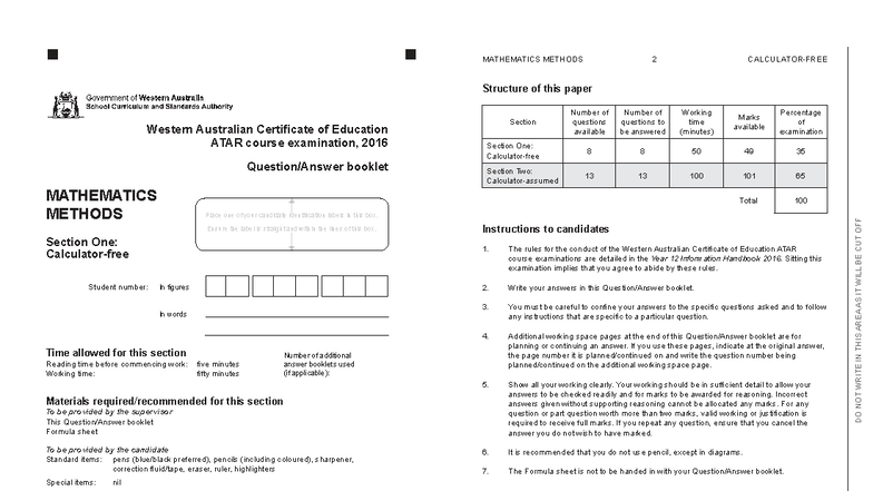 MATHEMATICS METHODS: ATAR Exam Question Booklet | Course Hero