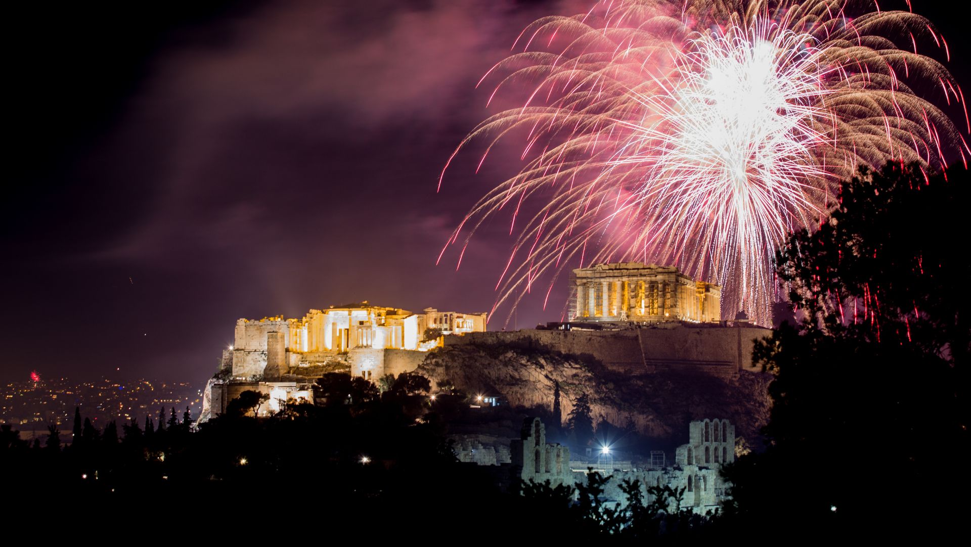 Fireworks explode over the ancient Acropolis hill with the Parthenon ...