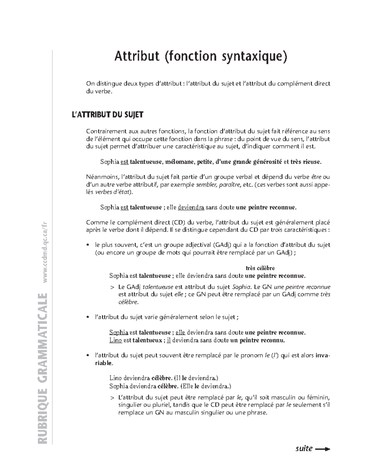 Fiche sur la fonction attribut - 1 RUBRIQUE GRAMMATICALE ccdmd.qc/fr ...