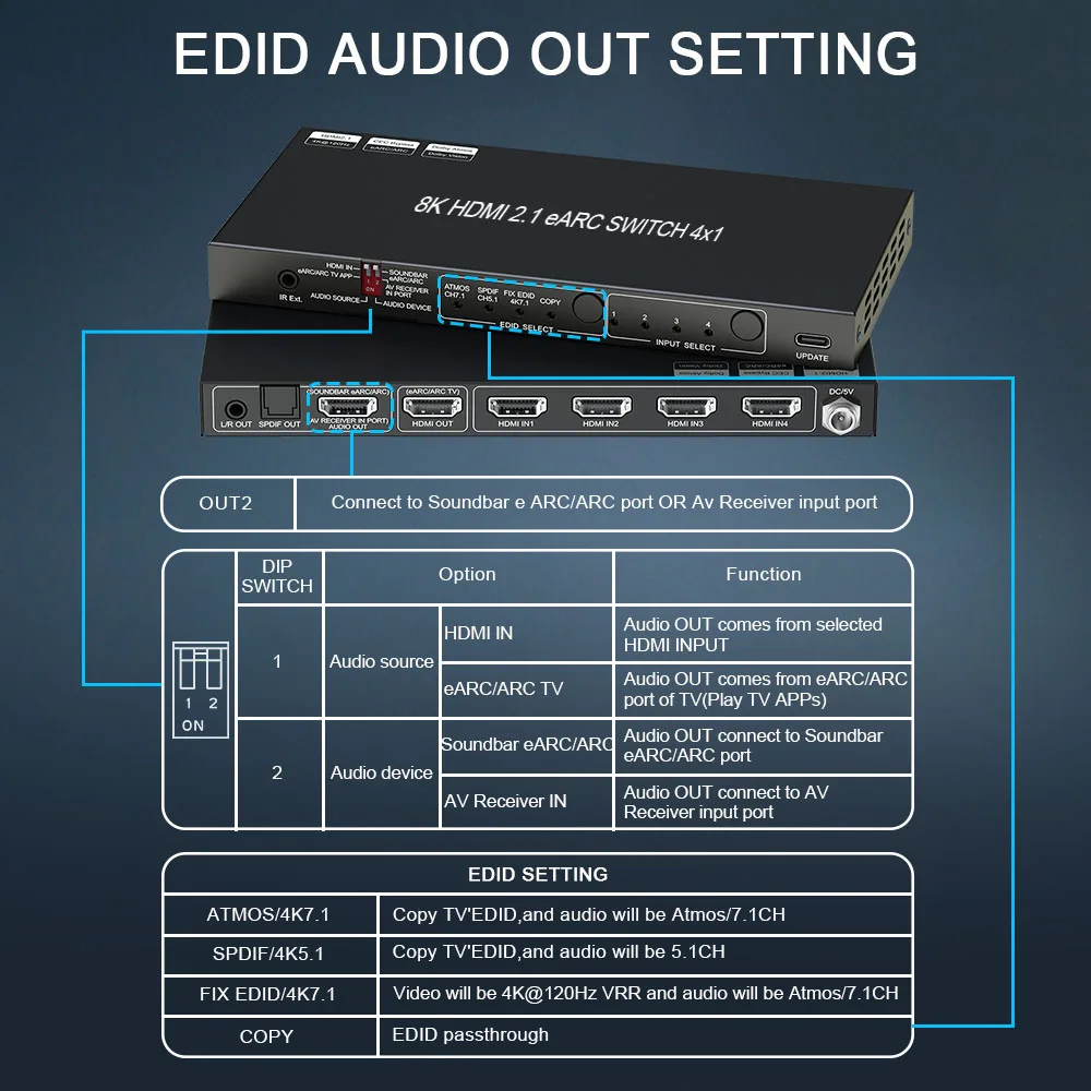 4K 120Hz HDMI 2.1 eARC Audio Extractor Switch 2x2 VRR ALLM HDCP2.3 ARC ...