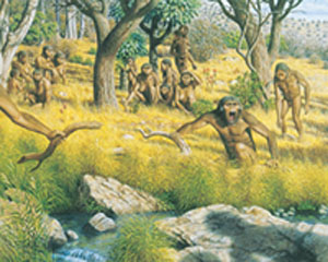 Australopithecus afarensis gathering fruit. Illustration of a group of ...
