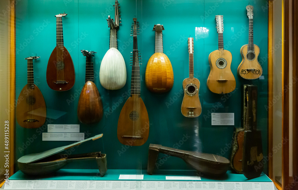 VIENNA, AUSTRIA - JANUARY 29, 2022: Old lutes and guitars in showcase ...