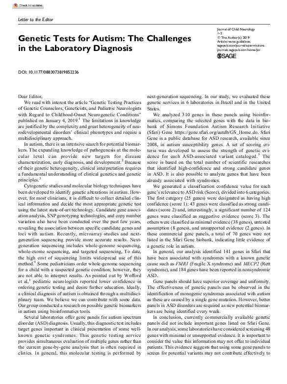 (PDF) Genetic Tests for Autism: The Challenges in the Laboratory Diagnosis