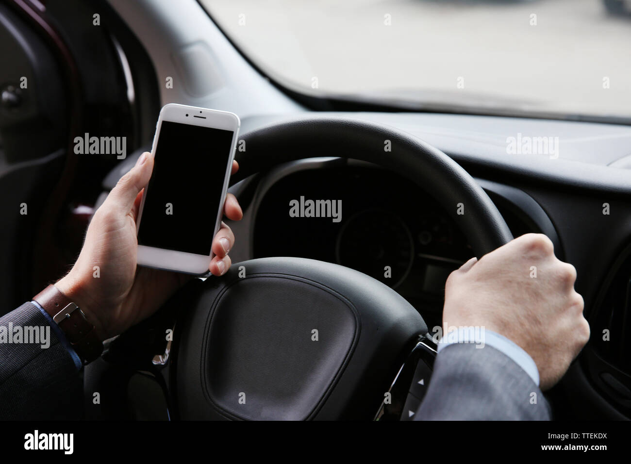 Man driver using smart phone on road in car Stock Photo - Alamy
